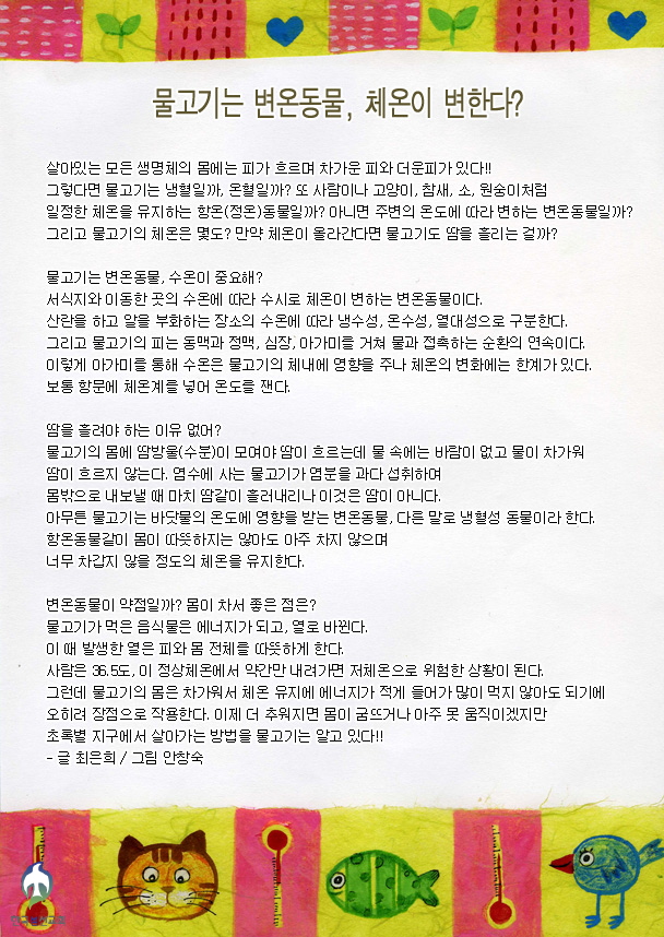 ¹°°í±â´Â ³ÃÇ÷? ¿ÂÇ÷µ¿¹°°ú ³ÃÇ÷µ¿¹°·Î ±¸ºÐÇÒ ¶§ ³ÃÇ÷µ¿¹°¿¡ ¼ÓÇÏÁö¸¸ ÀÌ·± ¸»º¸´Ù´Â Ç׿Â(Á¤¿Â)µ¿¹°°ú º¯¿Âµ¿¹°À̶ó´Â ¸»À» »ç¿ëÇÏÁÒ!! ¾Æ, ¹é»ó¾Æ¸®, û»ó¾Æ¸® µîÀÇ »ó¾î´Â ºÎºÐÀûÀ¸·Î ¿ÂÇ÷µ¿¹°À̶ø´Ï´Ù. ¹°°í±â´Â Á¤¿Âµ¿¹°ÀÎ »ç¶÷°ú ´Þ¸® º¯¿Âµ¿¹°À̸ç ÀÚüÀûÀ¸·Î ¿Âµµ¸¦ Á¶ÀýÇÏÁö ¸øÇÏ°í ¿ÜºÎ¿Âµµ¿¡ ÀûÀÀÇϱâ À§ÇØ ´Ù¾çÇÑ ÇൿÀ» ÇÕ´Ï´Ù. ÇÞºû°ú ±×´ÃÀ» ¿À°¡¸ç ü¿ÂÀ» Á¶ÀýÇÏ´Â °ÍÀÌÁö¿ä. À̰ÍÀº ¹°°í±â°¡ ½º½º·Î ü¿À» ³¾ ¼ö ¾ø±â ¶§¹®¿¡ ±×·¸½À´Ï´Ù. ¸ö¿¡ ÇÊ¿äÇÑ ¿À» ÃæºÐÈ÷ »ý¼ºÇÏÁö ¸øÇØ ÁÖÀ§ ȯ°æÀÇ ¿µÇâ¿¡ µû¶ó ü¿ÂÀÌ ´Þ¶óÁö´Âµ¥ ¼ö¿ÂÀÌ ±Þº¯ÇÏ°Ô º¯ÇÏ¸é ½ºÆ®·¹½º¸¦ ¹Þ¾Æ Áúº´¿¡ °É¸®°Ô µÇ´Â ÀÏÀÌ »ý±é´Ï´Ù. ´Ã ÀûÇÕÇÑ ¼ö¿ÂÀ» ã¾Æ¼ ¿òÁ÷¿©¾ß Çϱ⿡ ¹°°í±â´Â Âü ºÎÁö·±ÇÑ °Í °°½À´Ï´Ù. ¹°°í±â ü¿ÂÀº ¸î µµ? Á¤È®ÇÏ°Ô ¸»Çϱâ´Â ¾î·Æ½À´Ï´Ù. ¹°°í±â°¡ ¾ËÀ» ³º°í »ê¶õÇÏ´Â ¿Âµµ°¡ 15µµ ÀÌÇÏÀÇ ¼ö¿ÂÀÌ¸é ³Ã¼ö¼º, 15~20µµ »çÀÌ´Â ¿Â¼ö¼ºÀ̰í, 20µµ ÀÌ»óÀÌ¸é ¿´ë¼ºÀ¸·Î ºÐ·ù¸¦ Çϰí ÀÖ½À´Ï´Ù. ¹°°í±âÀÇ Ã¼¿Â°ú ¾î¾÷°úÀÇ °ü°è? ¹°°í±âÀÇ Ã¼¿Â ÃøÁ¤ÀÌ ±×·¸°Ô Áß¿äÇÏ°Ô »ý°¢µÇÁö ¾Ê°ÚÁö¸¸ ¿ø¾ç¾î¾÷À» ÇÏ´Â °æ¿ì¿¡ ±²ÀåÈ÷ Áß¿äÇÕ´Ï´Ù. Ä¿´Ù¶õ ¹°°í±â¸¦ ³Ãµ¿»óÅ¿¡¼ Àå°Å¸® ¼ö¼ÛÀ» ÇØ¾ß Çϱ⠶§¹®¿¡ ¸ö ¼Ó±îÁö ¾ó¸®±â À§Çؼ´Â ¹°°í±âÀÇ Ã¼¿ÂÀ» ¾Ë¾Æ¾ß ±×¿¡ µû¸¥ ³Ãµ¿ÀåÄ¡ Á¶ÀýÀÌ °¡´ÉÇϰÚÁö¿ä. ¹°°í±â°¡ ¶¡À» È긮Áö ¾ÊÀ¸´Ï ¾Æ¹«·¡µµ ¶¡Àº À°Áöµ¿¹°¿¡¼ ã¾ÆºÁ¾ß ÇϰÚÁö¿ä.