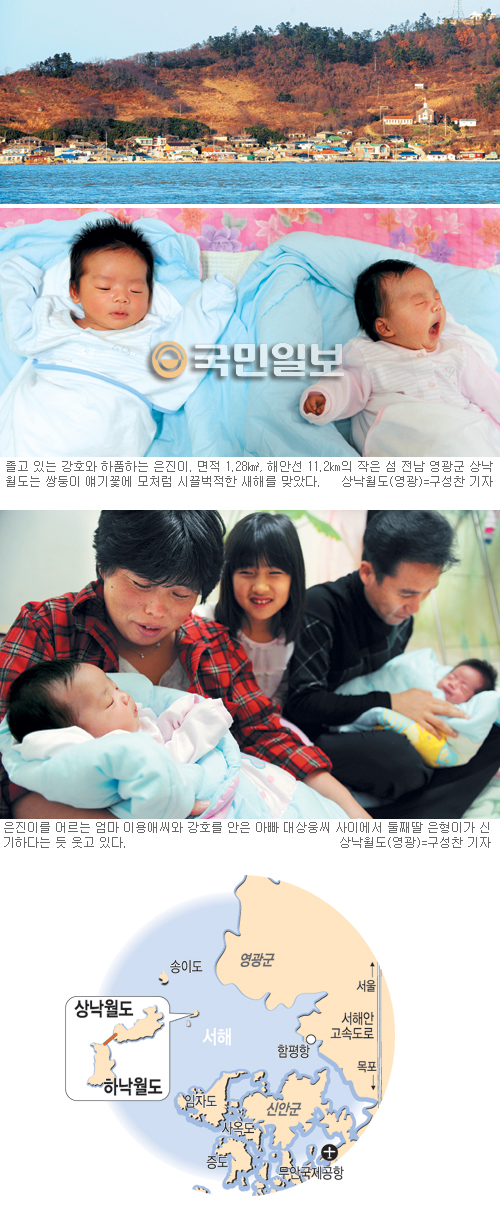 Áö³ÇØ 3¿ù ÃÊ, ¼¶ ¹ßÀü¼Ò¿¡¼ ÀÏÇÏ´Â ´ë»ó¿õ(42)¾¾¿Í ¾Æ³» ÀÌ¿ë¾Ö(40)¾¾°¡ 1½Ã°£10ºÐ ¹è¸¦ Ÿ°í ¿µ±¤À¾ ±×¸°»êºÎÀΰú¿¡ °¬´Ù. Áø·á½Ç¿¡¼ ³ª¿Â ¾Æ³»´Â "ÀӽŠ¸Â´ë¡¦ ±×·±µ¥ ½ÖµÕÀÌ·¡"¶ó°í Çß´Ù. ÀÌ¹Ì ºÎºÎ¿¡°Õ À±È£(15¡¤Áß2)¿Í ÀºÇü(10¡¤¿©¡¤ÃÊ3) ³²¸Å°¡ ÀÖ´Ù. °èȹ¿¡ ¾ø´ø ¾Æ±â, ±×°Íµµ ÇѲ¨¹ø¿¡ µÑÀÌ´Ù.